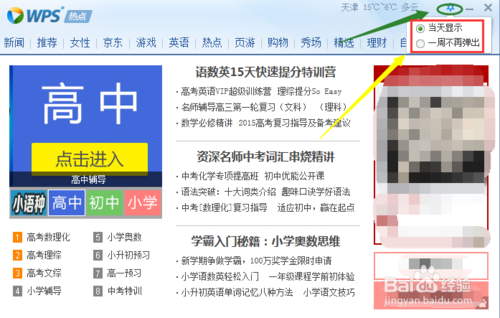以下是wps每天都会弹出的新闻热点窗口,相信很多人对它并不陌生吧,在该窗口的右上角有一个设置图标,点击之后可以设置该窗口为"当天显示"或者"一周不再弹出",如下图,也就是说我们最多只能设置一个星期的不弹出显示,一周以后又要如此操作才可以