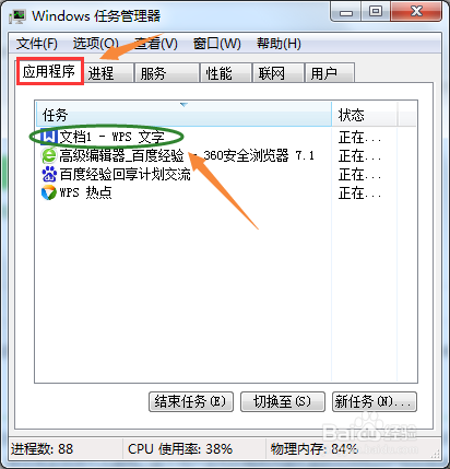 在任务管理器窗口的"应用程序"下,我们一定要确保此时WPS软件正在运行,从下图可以看出我们目前正在运行的软件