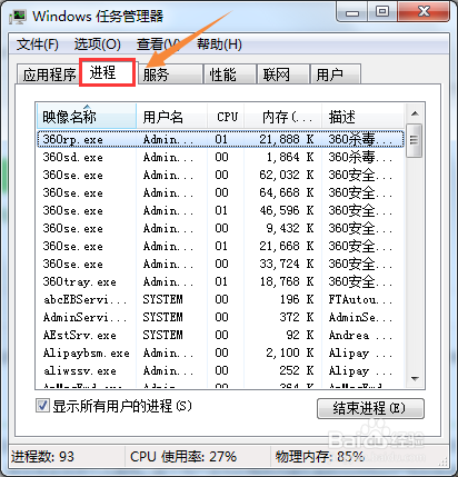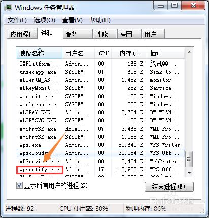 然后依旧在该窗口,我们将应用程序切换至右侧的"进程",然后一直往下拉动滚动条,知道我们看到一项映像名称为"wpsnotify.exe"的程序,如图,这就是导致每天新闻弹窗的"罪魁祸首"