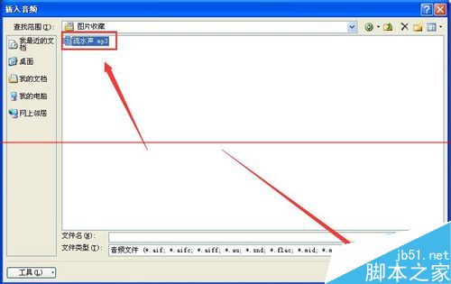 4、然后插入音频文件,点击“插入”-- “音频”--“来自文件”,然后找到声音文件,点击“插入”,如下图所示。