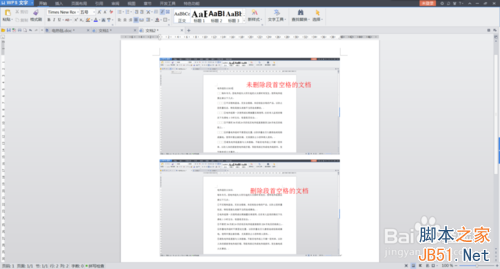 单击[删除段首空格]后,每一段落前的空格都会被删除。从下图对比,可以明显看出删除段首空格和未删除段首空格的不同处。