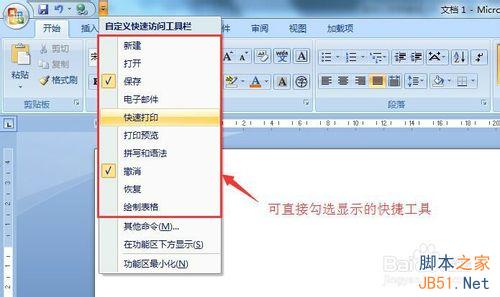 2、部分工具可直接快速勾选添加到快速工具栏中,包含:新建、打开、保存、电子邮件、快速打印、打印预览、拼写和语法、撤销、恢复、绘制表格。