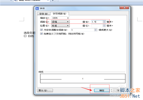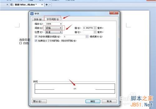 在弹出的字体对话框当中,选择“字符间距”,根据紧缩,调整两者之间的距离,注意调整时观察下面的预览。