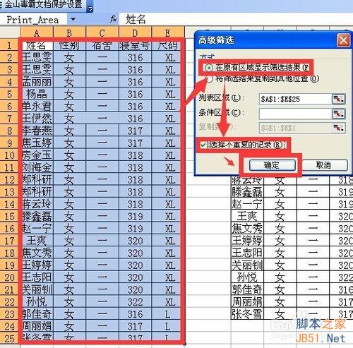 再次选中a1到e25这个区域 点按菜单栏 数据 筛选 高级筛选 在弹出的高级筛选对话框中的方式中点选在原有区域显示筛选结果 勾选显示不重复记录 点按确定