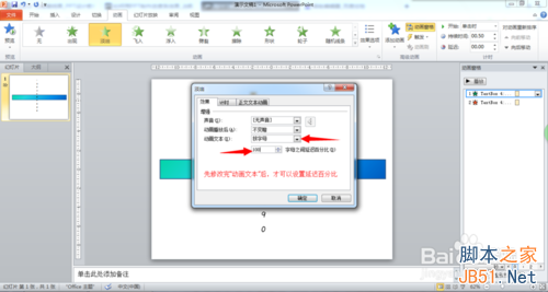 “效果”中将“动画文本”更改为“按字母发送”,并且设置成“100字母延迟百分比”。