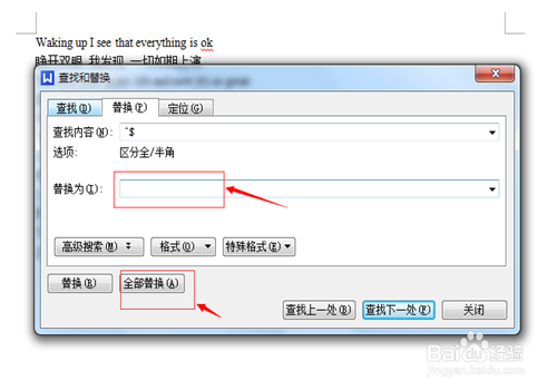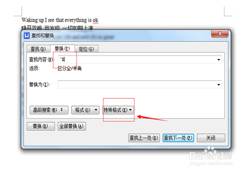 在查找替换对话框当中,点击“特殊格式:选择”任意字母“然后查找内容栏就会出现‘s这个符号。