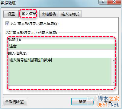 还有呢,在输入信息前当点击单元格时可以让其显示输入提醒。这个操作还是在“数据验证”下,在“输入信息”选项卡。小编的提醒设置为“标题:注意 内容:请输入编号为5为阿拉伯数字”。