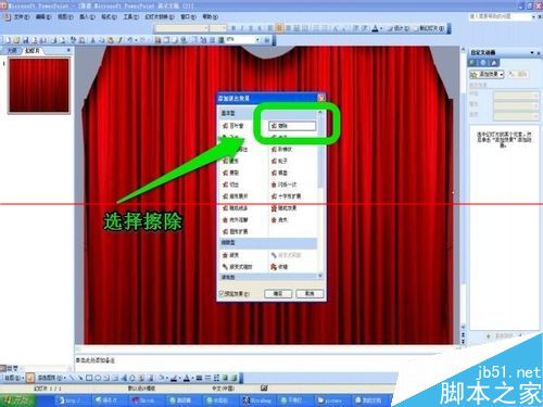 12、设置右侧拉幕自定义动画选项,参数为开始:(之后)、方向(从左侧)、速度(非常慢)