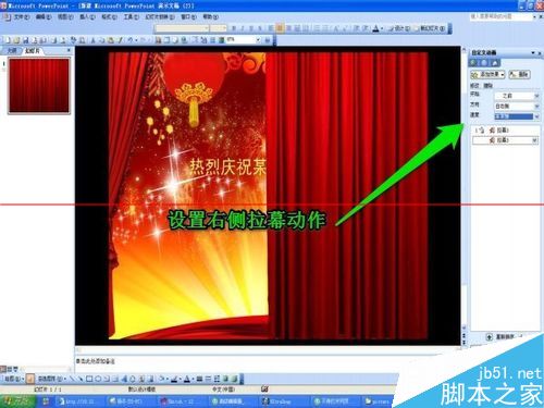 11、设置左侧拉幕自定义动画选项,参数为开始:(单击)、方向(从右侧)、速度(非常慢)