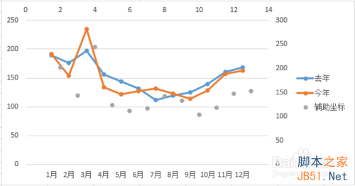 1.两个纵轴--最小值70,最大值250,单位主要30,下图1