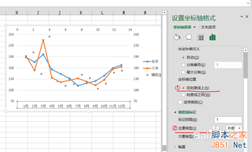 2.下面的横轴--坐标轴位置【在刻度线上】,选择适当刻度线标记,下图2