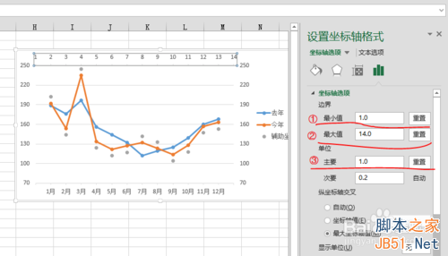 3.上面的横轴--最小值1,最大值14,主要单位1,选择适当刻度线标记,下图3