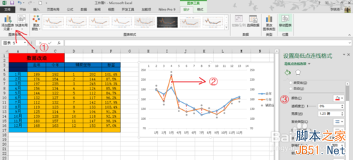 ①【菜单栏】设计--【左上角】添加图表元素--线条--高低点连线