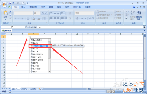 输入【RANDBETWEEN】函数时有个小技巧,在输入=后按键盘上的R键,可以在里面选择RANDBETWEEN函数。用单击一下RANDBETWEEN函数,此时不要按键盘上的回车键。