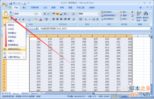 接下来把RANDBETWEEN函数生成的随机数字变成数字式,将生成的随意数字全部选择,按键盘上的【ctrl+c】复制一下。单击【粘贴下拉菜单里面的选择性粘贴】。