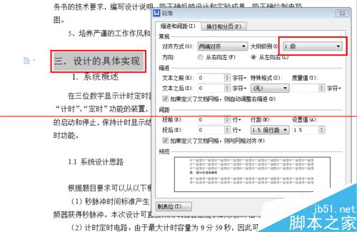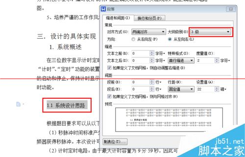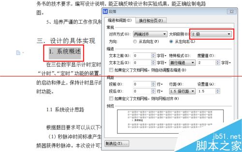 4、接着,以相同的办法设置二级目录,即选中相关文字并调出“段落”对话框后,将大纲级别设置为“2级”。