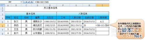 在年限列的格内写上如图所示公式,其中括号内为“当前日期”减去“入职日期”的时间间隔,然后用这个时间间隔除以一年的天数365(每年的天数可以根据当年实际填入),就得到了入职的年限