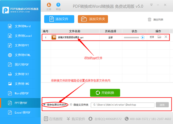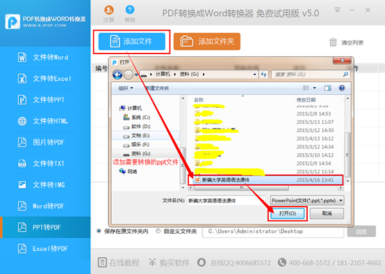 第2步:点击软件中的“添加文件”按钮,将需要转换的ppt文件添加到软件中,用户也可以直接使用鼠标将ppt文件拖拽到软件上进行快速添加,并且可以同时添加多个文件。