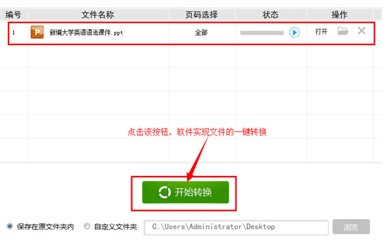 第3步:文件添加成功,此时大家可以设置转换文件的存储位置,大家可以选择保存在原文件夹内,也可以选择自定义文件夹,选择自定义文件夹的用户可以通过“浏览”按钮设置文件保存位置。这里我们可以设置成“保存在原文件夹内”。