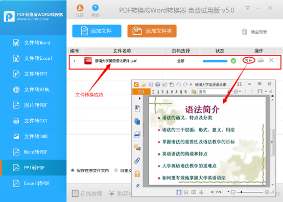 第5步:迅捷PDF转换器转换速度非常快,几秒钟之后大家就可以看到文件转换成功。大家可以点击“打开”按钮打开转换后的PDF文件,查看转换效果。