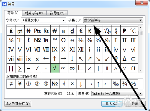 点击“符号”,选择“字体”里“普通文本”,“子集”里选择“数字运算符”,选择“√”