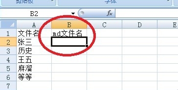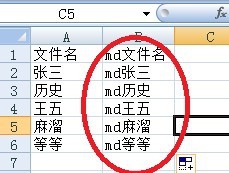 2、在文件名的右边一列输入=“md” &a1,记住&前有一个空格,然后回车