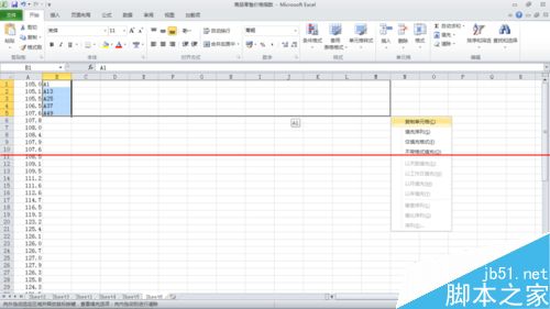 2、继续将鼠标放至右下角,按住右键不放将鼠标右拉至M列处,此时弹出对话框。在对话框中选择“填充序列”,结果如图。