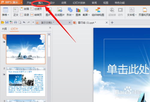 首先,打开ppt,在最上面的菜单栏里选择【插入】选项。