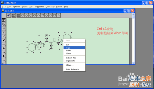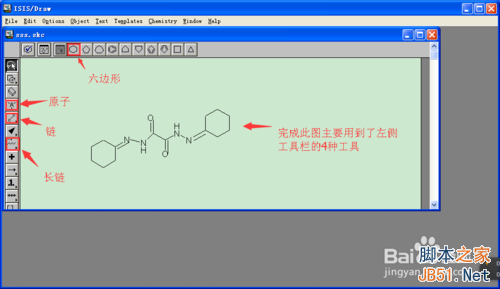 ISIS DRAW很好用,和系统自带的画图差不多,直接点击所需要的形状,在合适的位置放置即可。如本例中”双环己酮草酰二腙”的完成主要用到了左侧工具栏的四种工具。保存文件,以备用。