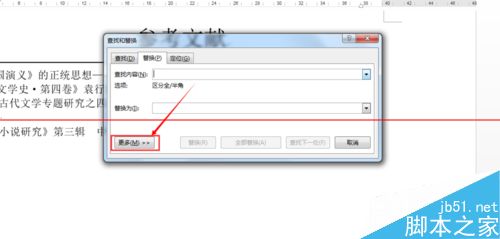 3、在弹出的【查找和替换】对话框中将鼠标定位在【查找内容】中,然后点击下方的【更多】按钮