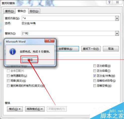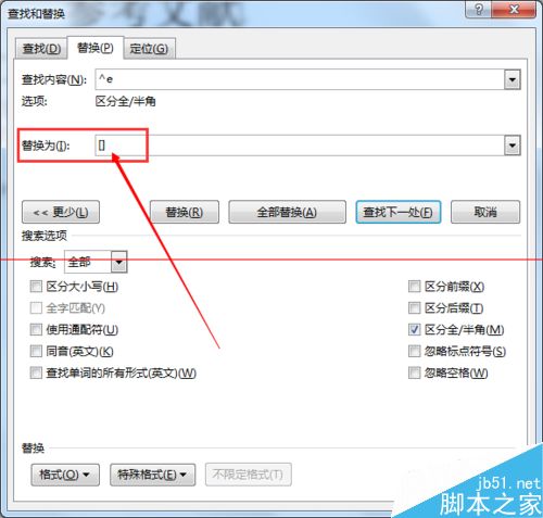 5、接着将光标定位在【替换为】一栏中,在该栏中输入英文半角状态下的中括号[];接着讲光标定位在中括号中间。