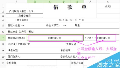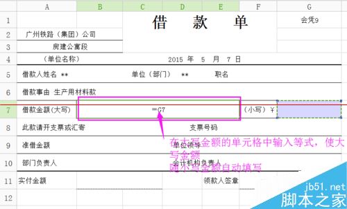 3、要使填写大写金额的单元格随小写金额所在单元格(G7)的数字变动而自动填写,则需要大写金额的单元格中输入公式式“=G7”,目的是让大写数字随小写数字自动填写。