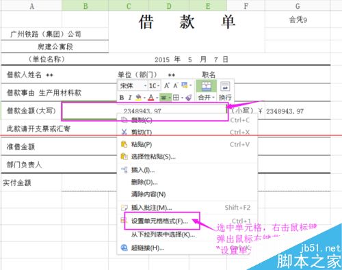 5、要大写的金额与小写金额一至后,但并没有达到我们要求,我们需要的是数字大写,怎么办呢?选择要大写的数字所在单元格,右击鼠标键后,弹出鼠标右键菜单栏,单击“设置单元格格式”,如下图所示: