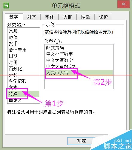 6、在“单元格格式”窗口,选择“特殊”中的“人民币大写”后,单击“确定”按钮即可。