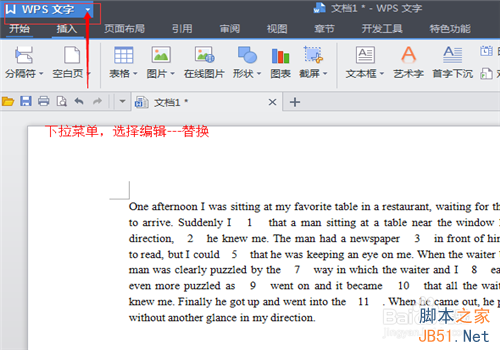 在左上角,点击【wps文档】旁边三角形,下拉菜单中,选择【编辑】--【替换】。或是是直接用键盘按照ctrl+h,直接打开替换菜单。