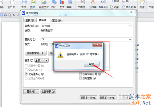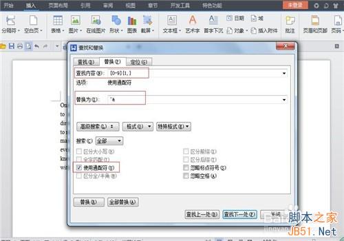 在替换对话框当中,我们要输入命令,如下图,在查找内容栏目输入 [0-9,{1},替换为栏目输入^&,下面勾选【使用通配符】,点击确认。