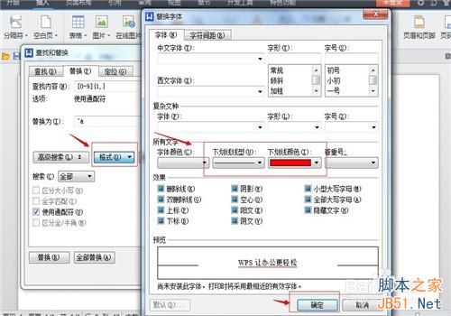 还可以在第三步骤当中,点击【格式】,选择【字体】。设置下划线的内容的颜色,如下图,在所有文字栏目当中选择下划线颜色为红色,点击确认。