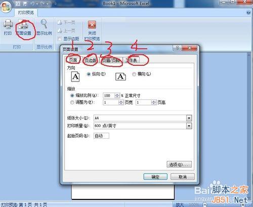 4、在弹出的先窗口中点击页面设置, 我们可以看到(如下图)1-页面,2-页边距,3-页眉/页脚,4-工作表四个选项卡,它们分别依次负责调整页面布局,调整页边距,添加页眉和页脚,以及工作表打印输出的一些高级选项(工作表选项新手很少使用),再熟悉了整个简单的页面设置后读者可以自行尝试对每一个选项进行亲自操作。