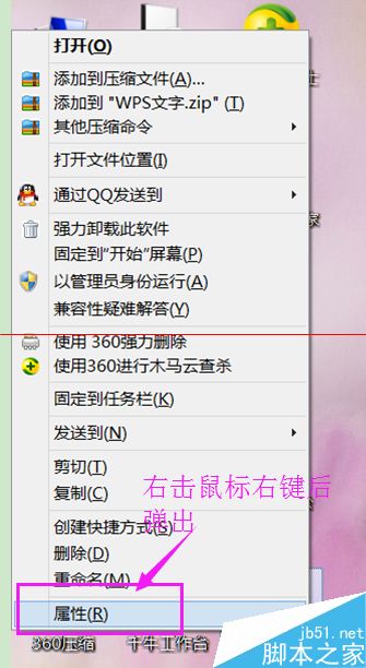 鼠标移至WPS文字(ET和WPP方法相同)上,单击鼠标右键,在弹出的快捷菜单中选择“属性”,如下图所示: