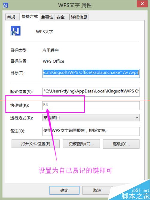 在“wps文字属性”对话框中选择“快捷键”选项卡,并在“快捷键”相对应的文本框内输入一个键做为快捷键(如下图所示),单击“确定”按钮,设置结束。