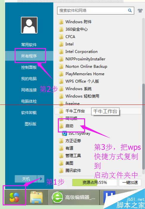 依次单击[开始]-[所有程序]-[启动],打开[启动]文件夹,把桌面上的WPS文字(ET和WPP同样操作)快捷方式复制到“启动”文件夹。这样只要打开计算机,WPS文字软件就会自动打开了。如果不想WPS文字自动启动了,只需要把“启动”文件夹中的WPS文字快捷方式删除既可。