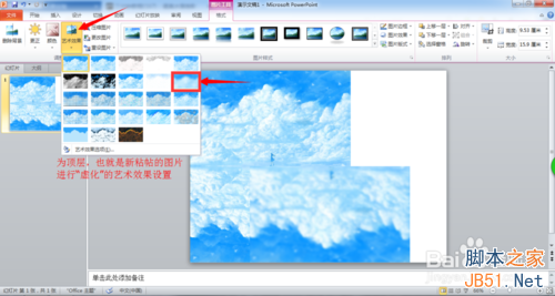 为上一步新粘贴的图片,进行编辑,设置图片的艺术效果为虚化。然后右击图片,在