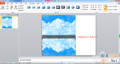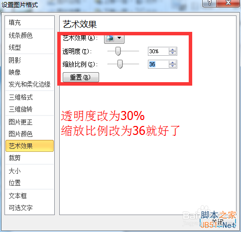 为裁剪过的图片设置水波的效果。首先为它设置艺术效果为“玻璃”。然后右击图片,在“设置图片格式中”将艺术效果的透明度改为“30%”,缩放比例改为“36”就好了。
