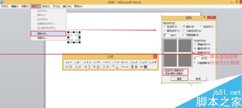 2、如图,在“公式”对话框里找到矩阵,就可以选择矩阵模板的样式插入,也可以自定义矩阵格式、样式等,如图,单击可添加矩阵外大括号或分割线,如果位置添加错误,继续单击分割线就可以消失了。