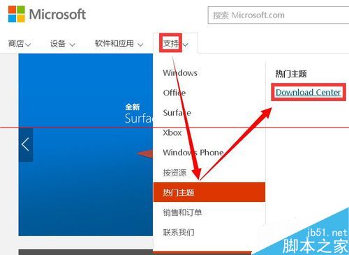 2、在支持下 找到热门主题 然后在弹出的菜单中点按download center 如下图所示