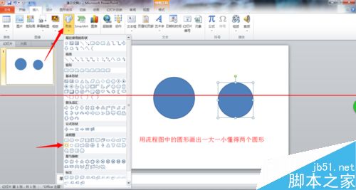 1、首先,在需要插入圆环形数据的PPT中,插入一大一小的两个圆形。PS.使用流程中的圆形就好了,连个圆形的大小不要相差太大