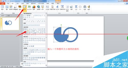 3、插入一个和圆环大小相同的扇形。PS.更具你的实际需求,你可以更改扇形缺口的大小