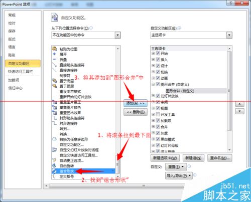 4、在列表的最下面,找到“组合图形”,接着将它“添加”到之前建立好的“图形合并”中,最后点击确认退出后就自动生效了。PS.这里的“组合形状”可是有小箭头的,意味着它是多个功能的合并