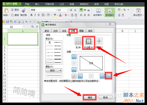 4、再选择“边框”标签,按下“外边框”按钮,这是为了使表头的外框有线;
