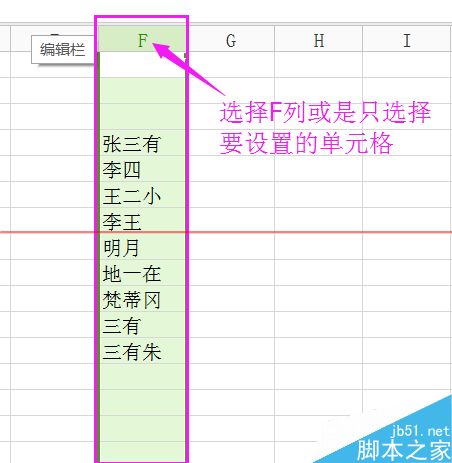 2、首先选择图中所示整列(如F列),也可以仅选择我们要设置的单元格,如下图所示: